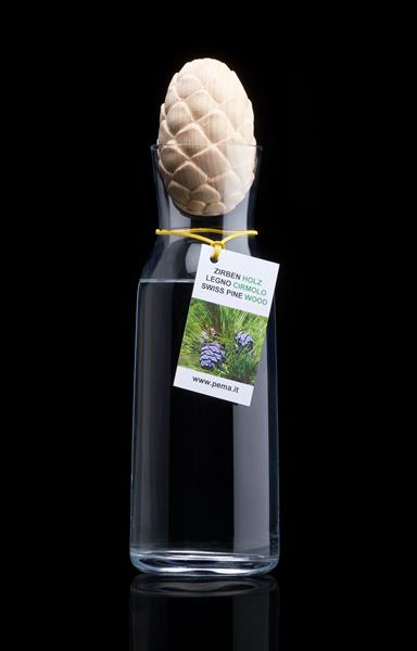 Der unbehandelte Zirben-Zapfen verschließt Ihre Wasser-Karaffe. Er beschützt den Inhalt und bereichert das Wasser mit einem angenehmen Duft und Geschmack. Genießen Sie Schluck für Schluck ein Stück Natur.